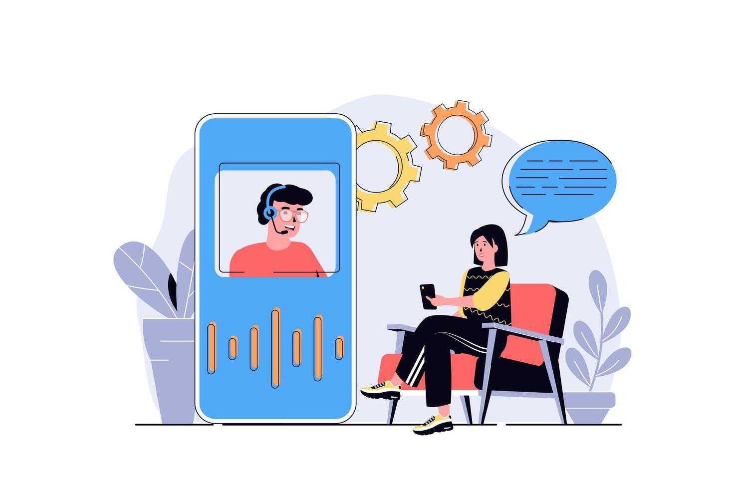 Virtual assistant web concept with cartoon people design. Woman connecting with operator of customer support service and making calling. Flat illustration isolated on white background. Pro Vector
