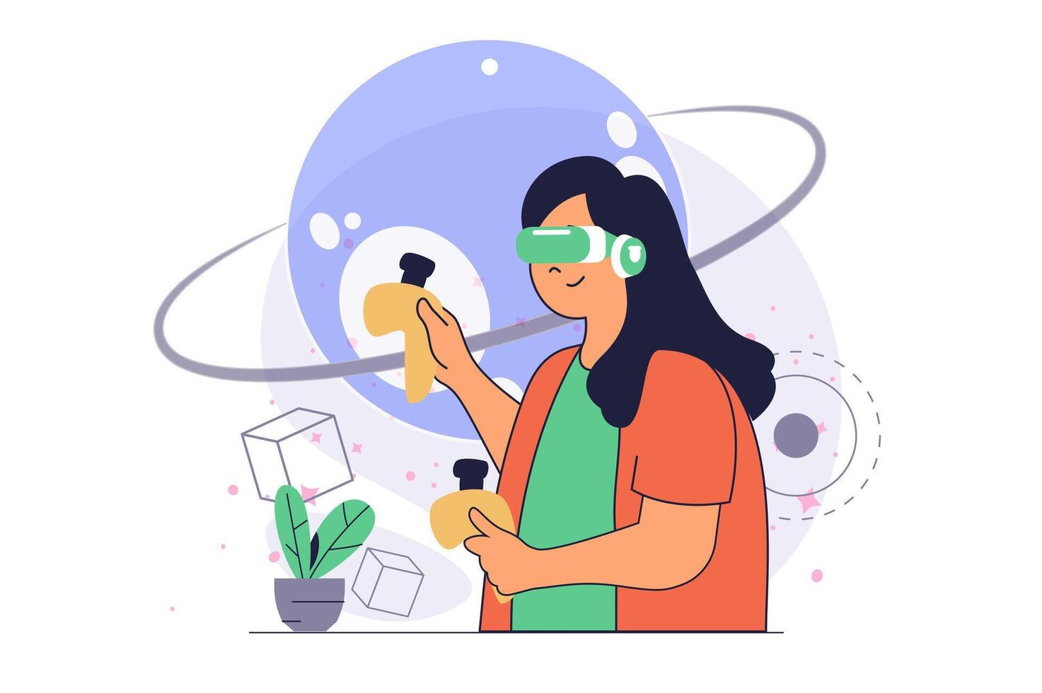 Virtual reality concept with cartoon people in flat design for web. Woman in VR headset with hand controllers exploring cosmic space simulation, learning planets in cyberspace. illustration. Pro Vector