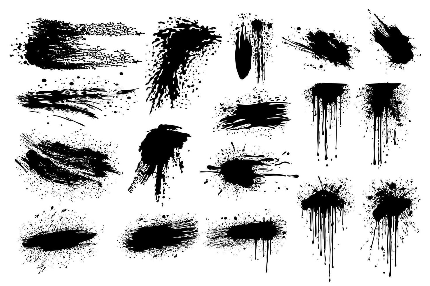 Grunge black ink splatters set elements in flat graphic design. Collection of liquid strokes and spots with messy grainy texture, flowing stains and blobs with splash drops. illustration. Pro Vector