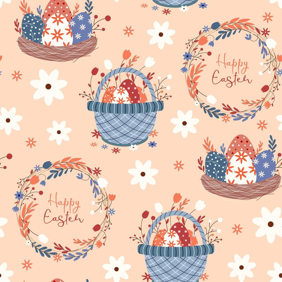 Seamless pattern with Easter elements, a basket and a nest with eggs. illustration Pro Vector