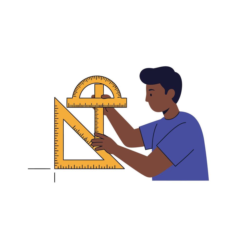 A young man using a protractor and triangle ruler for precise measurements in a flat, minimal design illustration Pro Vector