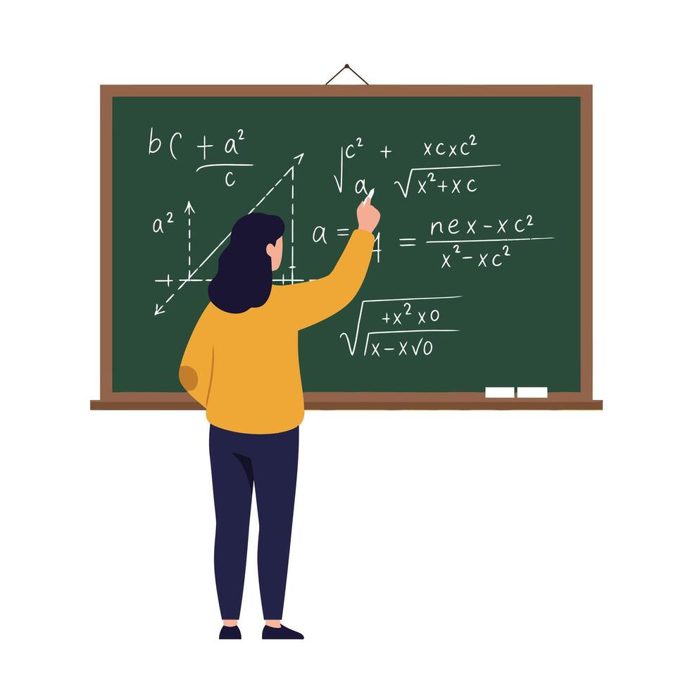 Teacher explaining mathematical equations on a green chalkboard, showcasing flat design style, in a classroom setting, creating an engaging educational atmosphere, illustration Pro Vector