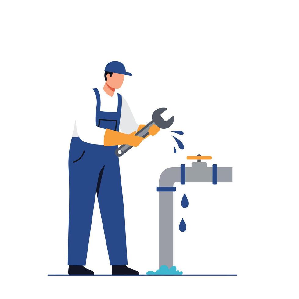 Plumber in blue overalls using a wrench to fix a leaking pipe in a flat minimal illustration Pro Vector