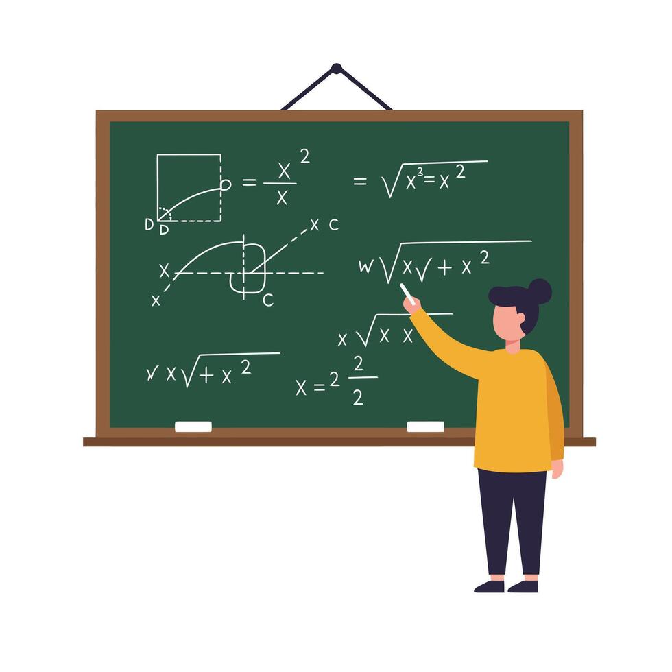 Teacher standing in front of a chalkboard explaining mathematical concepts in a minimal style illustration Pro Vector