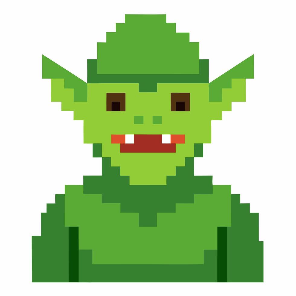 Pixel Art of Green Elf with Pointy Ears and Red Eyes in 8 Bit Style Pro Vector