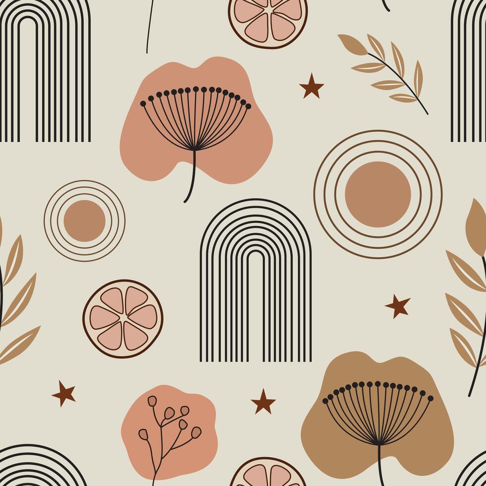 Seamless boho pattern with rainbows, flowers, citrus slices, stars, and leaves in warm earthy tones. Ideal for textile, branding, and creative design projects. Pro Vector