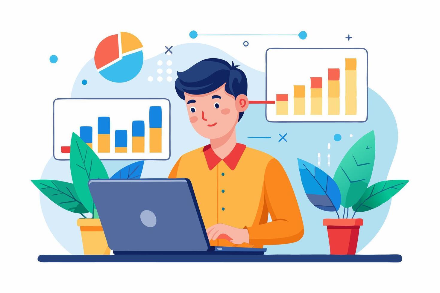Man working on laptop with graphs and charts Pro Vector