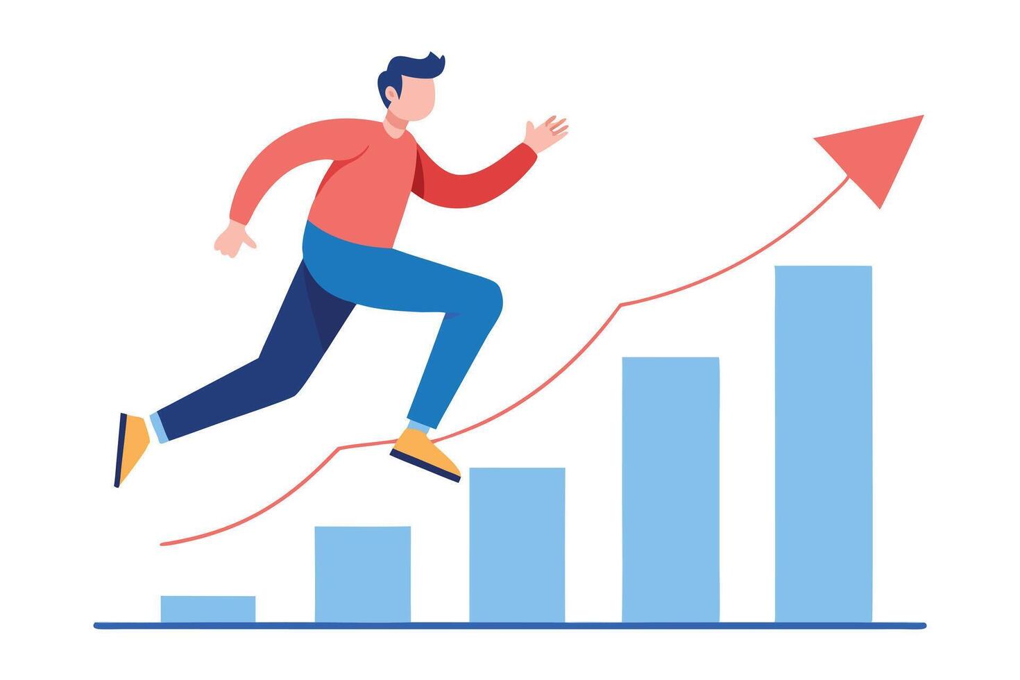Man Steps Up Light Blue Columns with Red Arrow on a White Background Flat vector