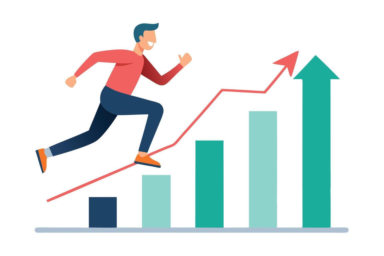 Man Running Upward on Arrow Over Bar Graph with White Background Design vector