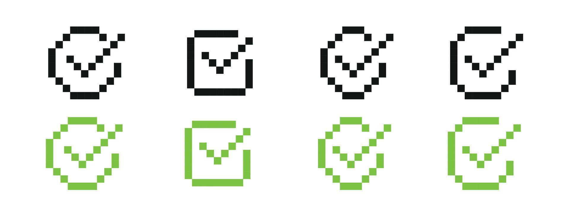 Pixel check box icons with green checkmarks for validation. Includes square and circular checkbox symbols in a minimalistic pixel art style. Pro Vector