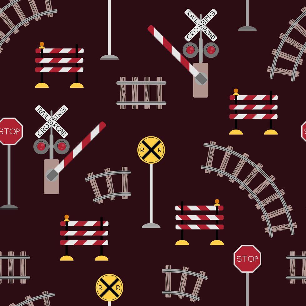 Seamless pattern with railway signs, rails and barrier in flat style. Childish background for fabric, wallpaper, scrapbooking, etc. Pro Vector