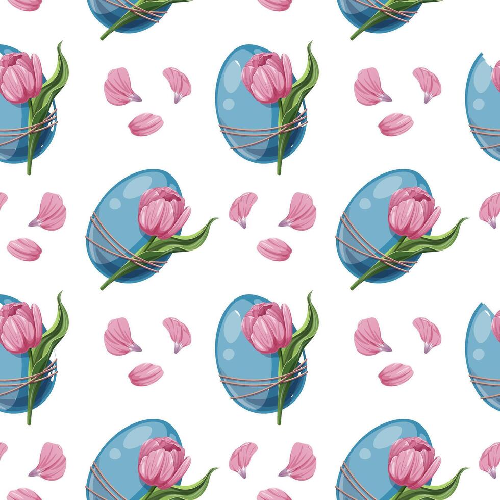 Seamless Pattern with Easter Egg and Pink Tulip. Easter Background for Fabric, Wallpaper, Wrapping Paper Pro Vector