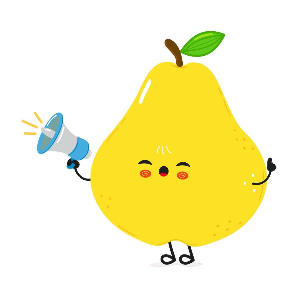 A happy pear cartoon character is joyfully promoting with a megaphone and pointing a direction. Pro Vector