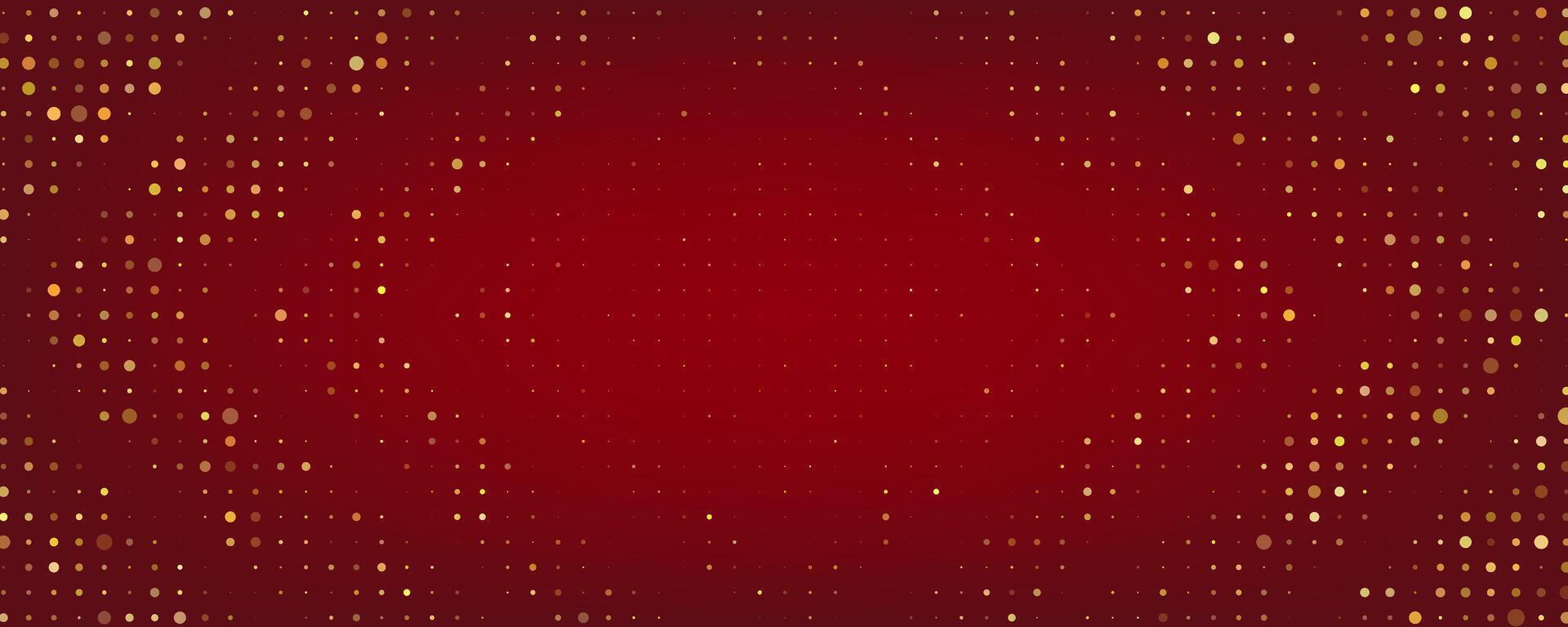 Trendy abstract background with golden circles and particles on red. Holiday gradient template. Modern halftone design. Pro Vector