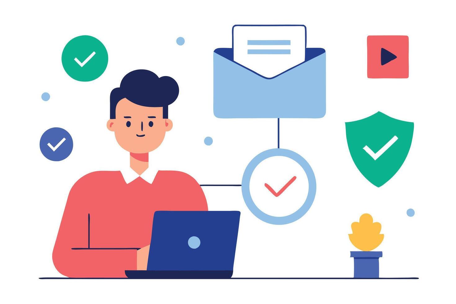 Young Man Using Laptop with Envelope, Shield, and Check Mark Flat Design vector