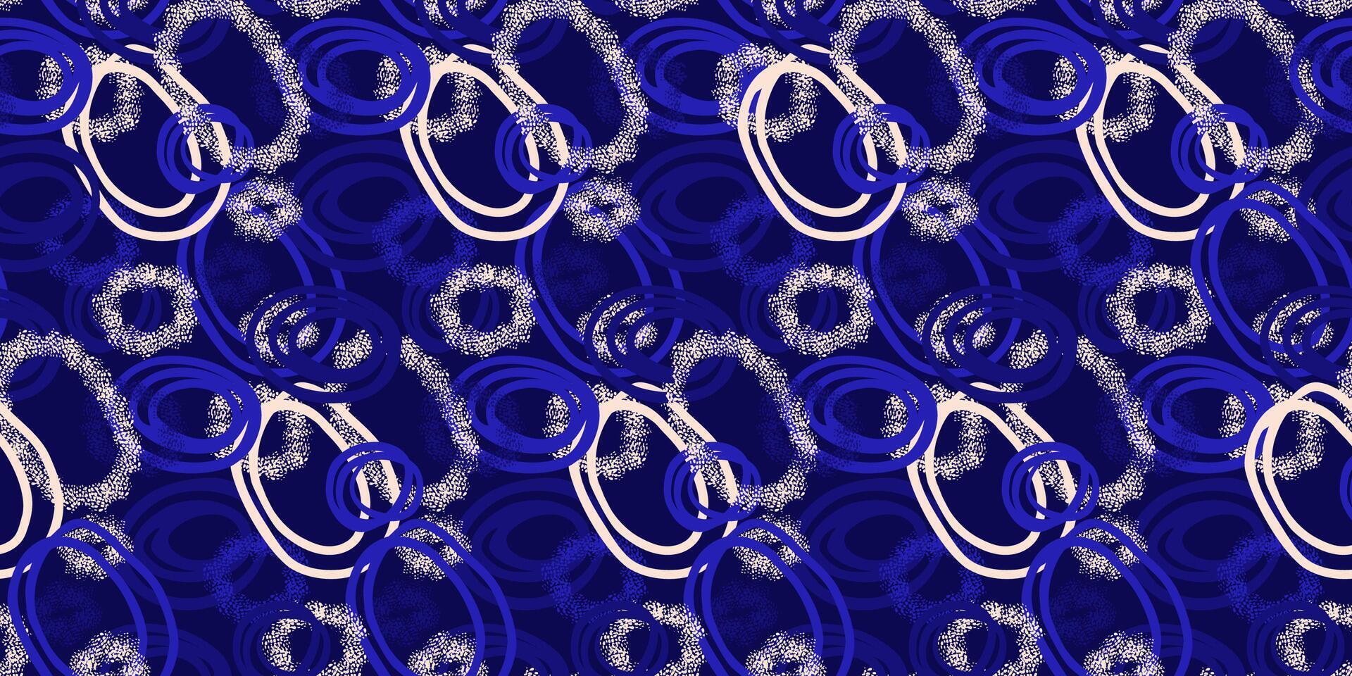 Modern abstract pattern featuring dynamic overlapping circles with dotted textures in dark blue and white on a deep navy background. Artistic and energetic design vector