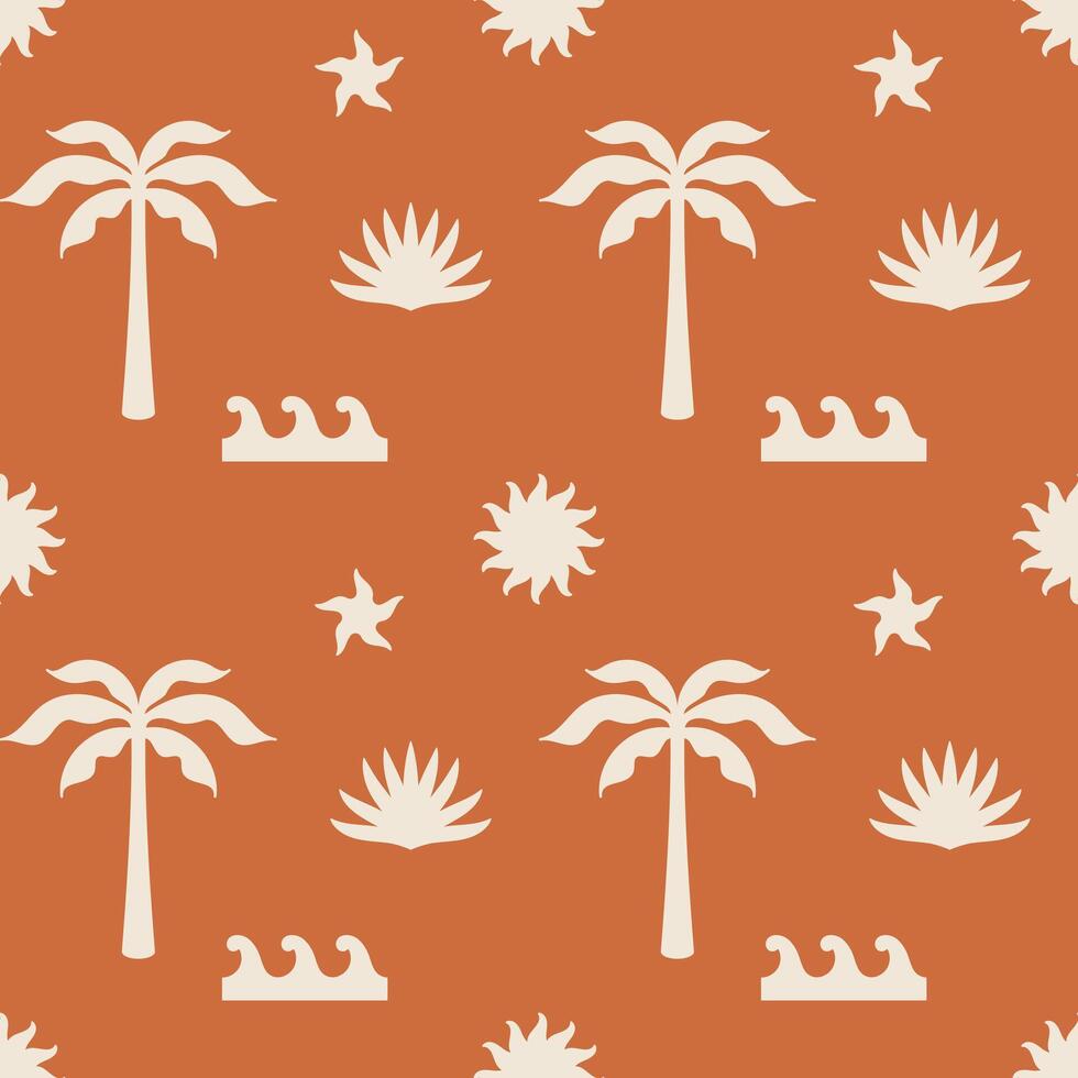 Summer seamless pattern with palm trees, sun, waves, starfish. Boho seamless pattern. Background design. Repeating print for fabric, wrapping paper, textile, wallpaper Pro Vector