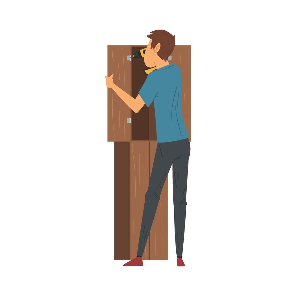 Man Assembling and Installing New Cupboard with Drill, Manual Furniture Assembly Illustration Pro Vector