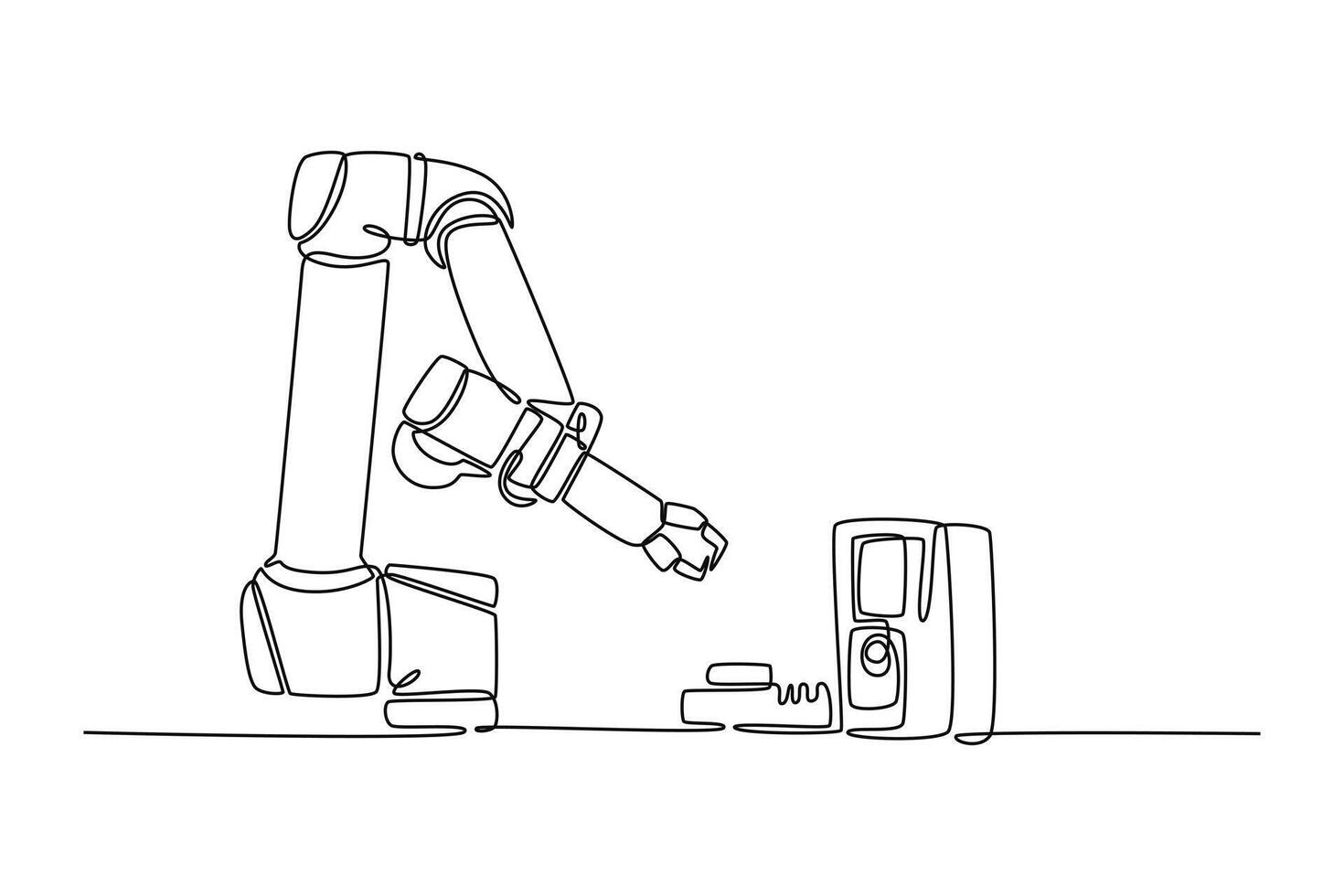 Industrial Programmable Robotic Arm in a Factory Development Workshop. Technology in business concept. Single line draw design. graphic illustration Pro Vector