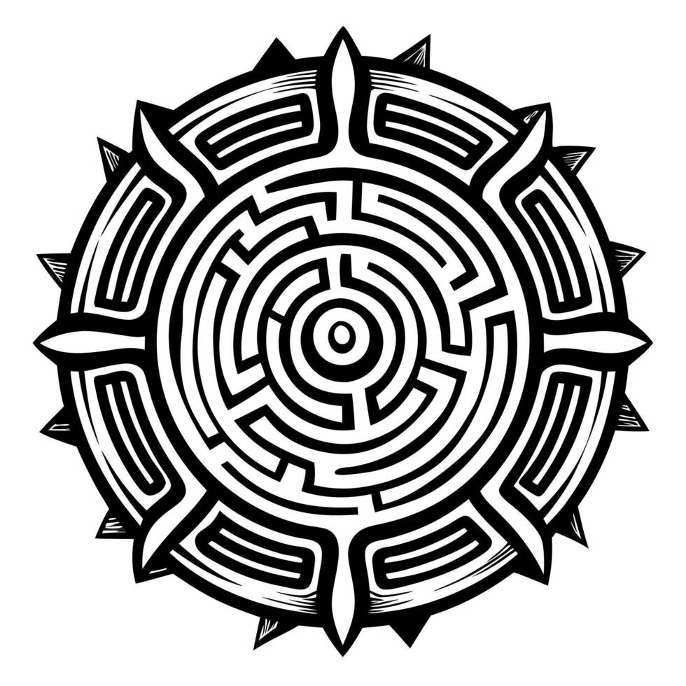 Intricate Circular Maze Design with Tribal Elements and Geometric Patterns Pro Vector