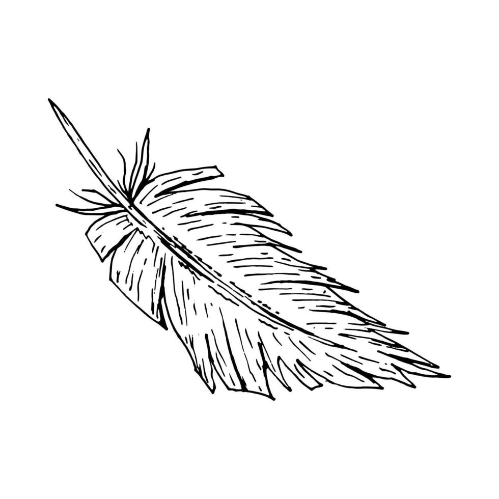 Hand drawn feather illustration in ink lineart style. Monochrome artwork for use in textile design, farm and wedding branding, Easter graphics, boho packaging, craft projects and rustic stationery. Pro Vector