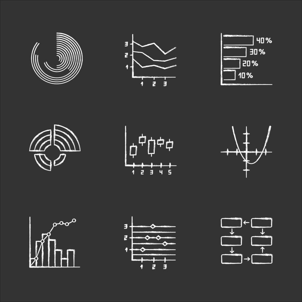 Chart and graph chalk icons set. Horizontal histogram. Area chart. Function curve. Radial diagram. Pareto curve. Figure chart. Data connection and wiring. Isolated vector chalkboard illustrations Pro Vector