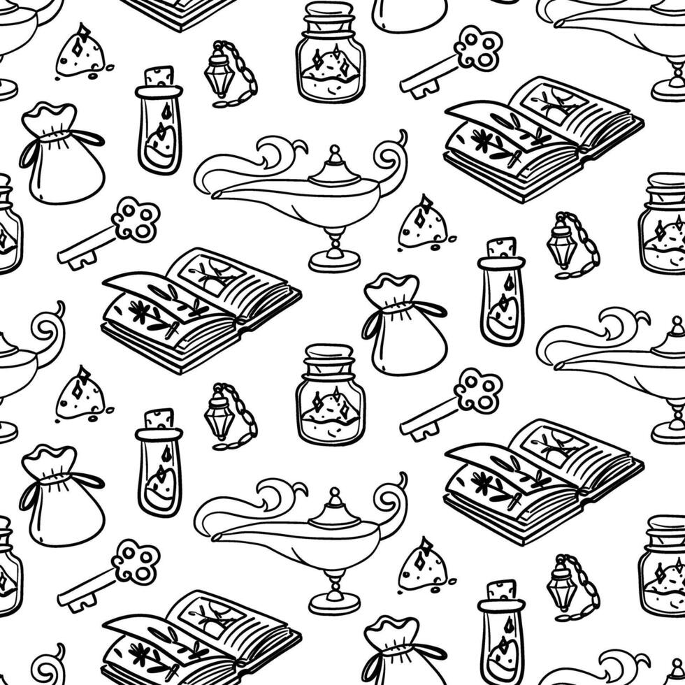 pattern of a book, lamp, magic dust, pendant, key with magic tools in the style of doodles. Monochrome seamless. Suitable for fantasy projects, books, games, and artwork related to magic, alchemy Pro Vector