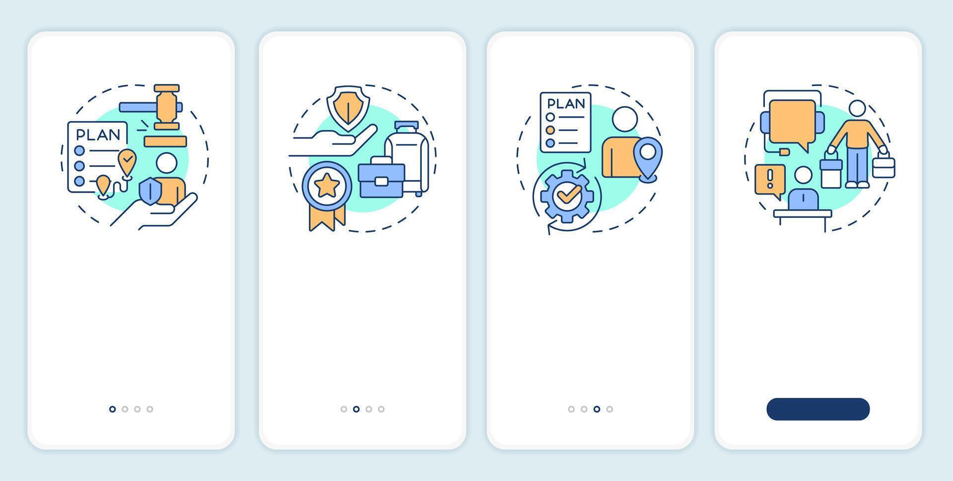 Benefits of travel risk management onboarding mobile app screen. Walkthrough 4 steps editable graphic instructions with linear concepts. UI, UX, GUI template Pro Vector