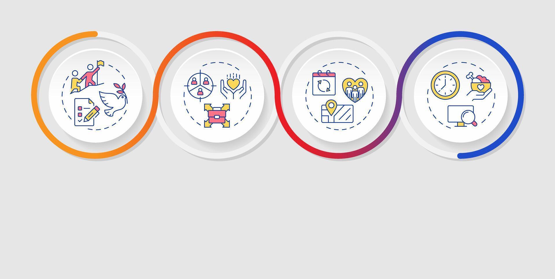 Volunteer management infographics circles sequence. Nonprofit social activity regulation. Visualization layout with 4 steps. Info chart loop process presentation Pro Vector