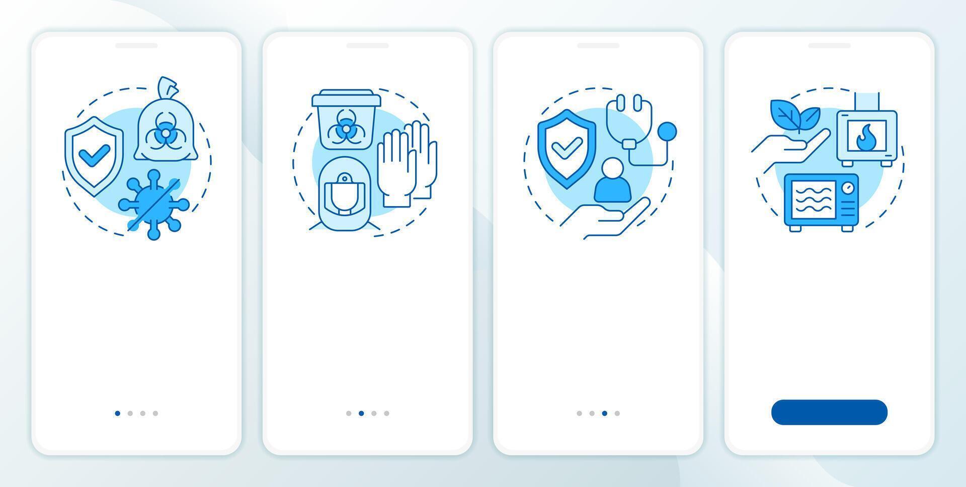Medical waste treatment benefits blue onboarding mobile app screen. Walkthrough 4 steps editable graphic instructions with linear concepts. UI, UX, GUI Pro Vector