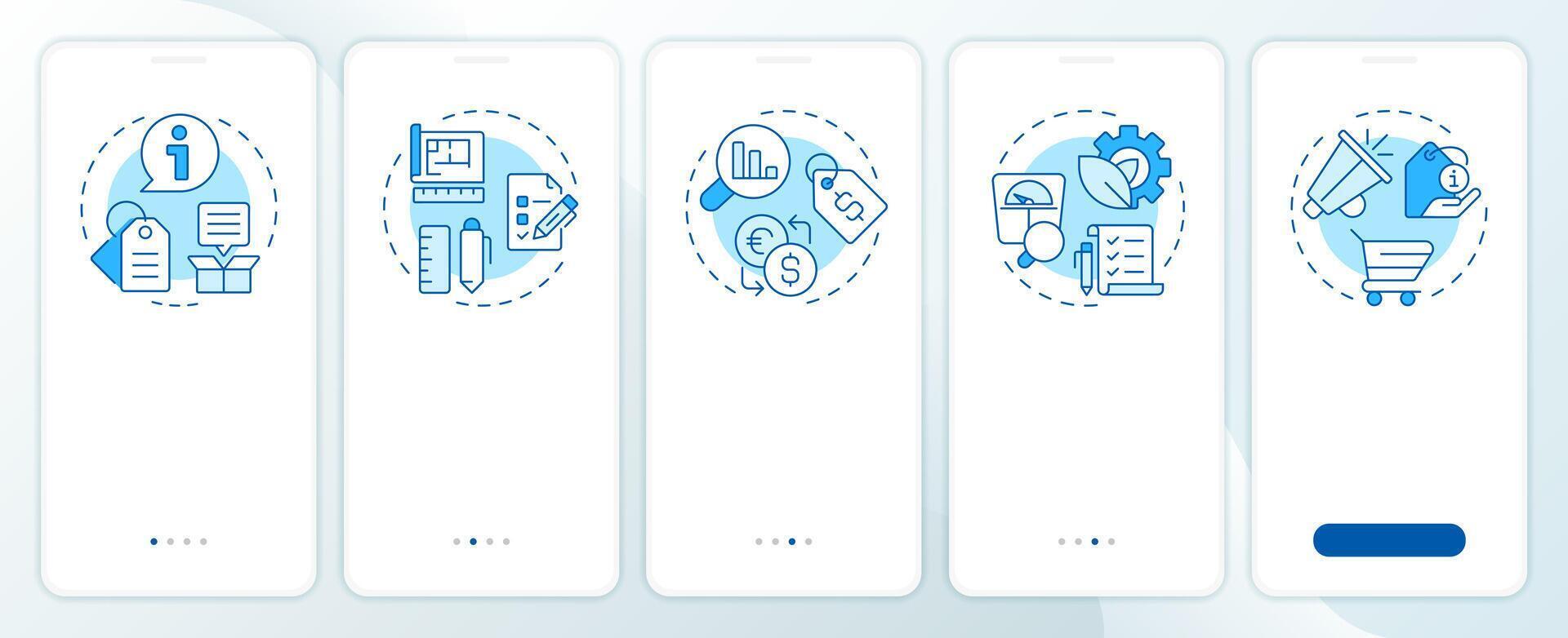 Product data sheet blue onboarding mobile app screen. PIM system. Walkthrough 5 steps editable graphic instructions with linear concepts. UI, UX, GUI Pro Vector