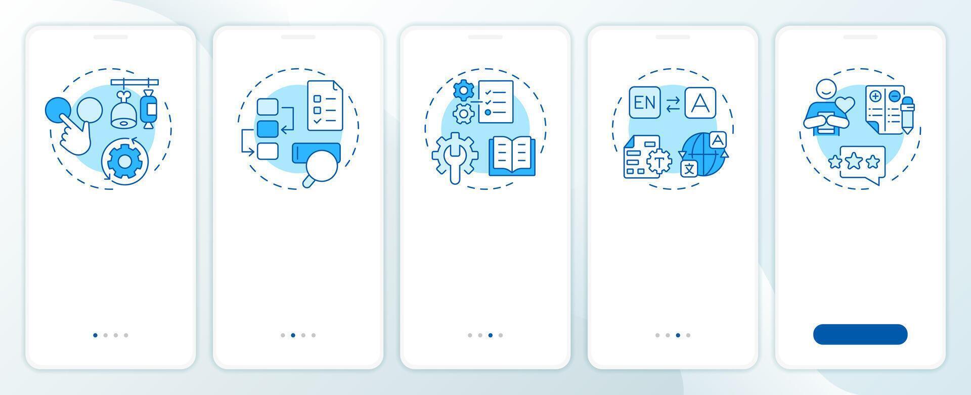 Key product information blue onboarding mobile app screen. PIM system. Walkthrough 5 steps editable graphic instructions with linear concepts. UI, UX, GUI Pro Vector