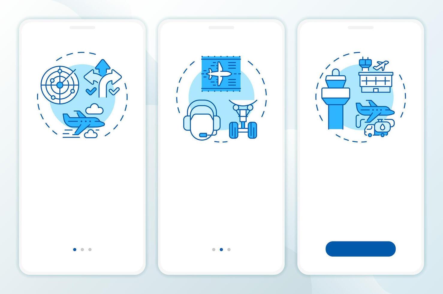 Airspace traffic control blue onboarding mobile app screen. Walkthrough 3 steps editable graphic instructions with linear concepts. UI, UX, GUI Pro Vector