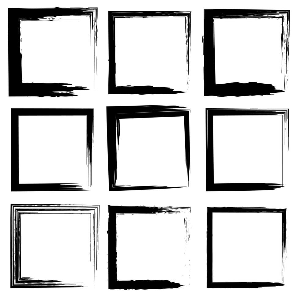 Collection of nine square grunge brush stroke frames in black. Each frame has a unique design, perfect for creative projects, invitations, or digital art. vector