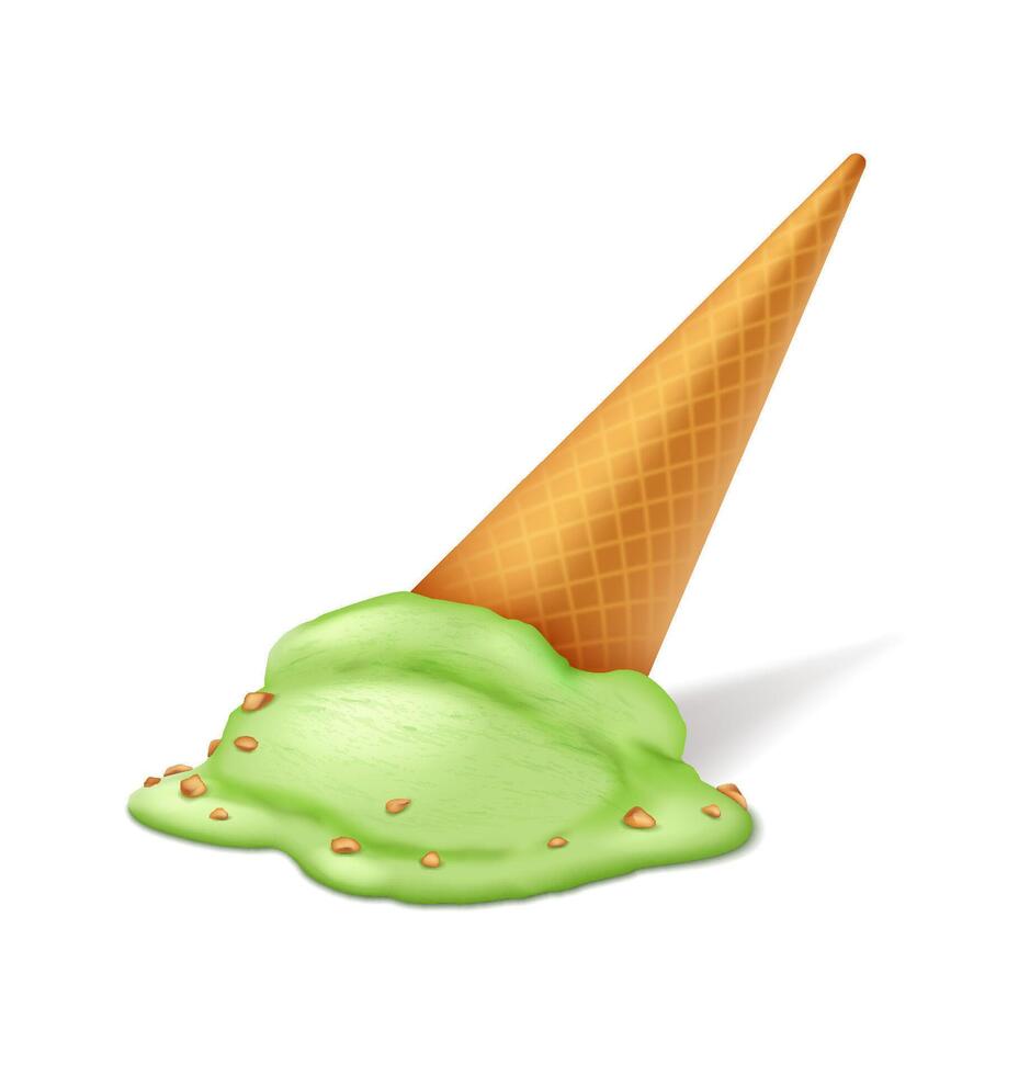 Illustration of a fallen ice cream cone with green ice cream melting on a clean white surface. The cone lays at an angle, adding a sense of realism. Pro Vector