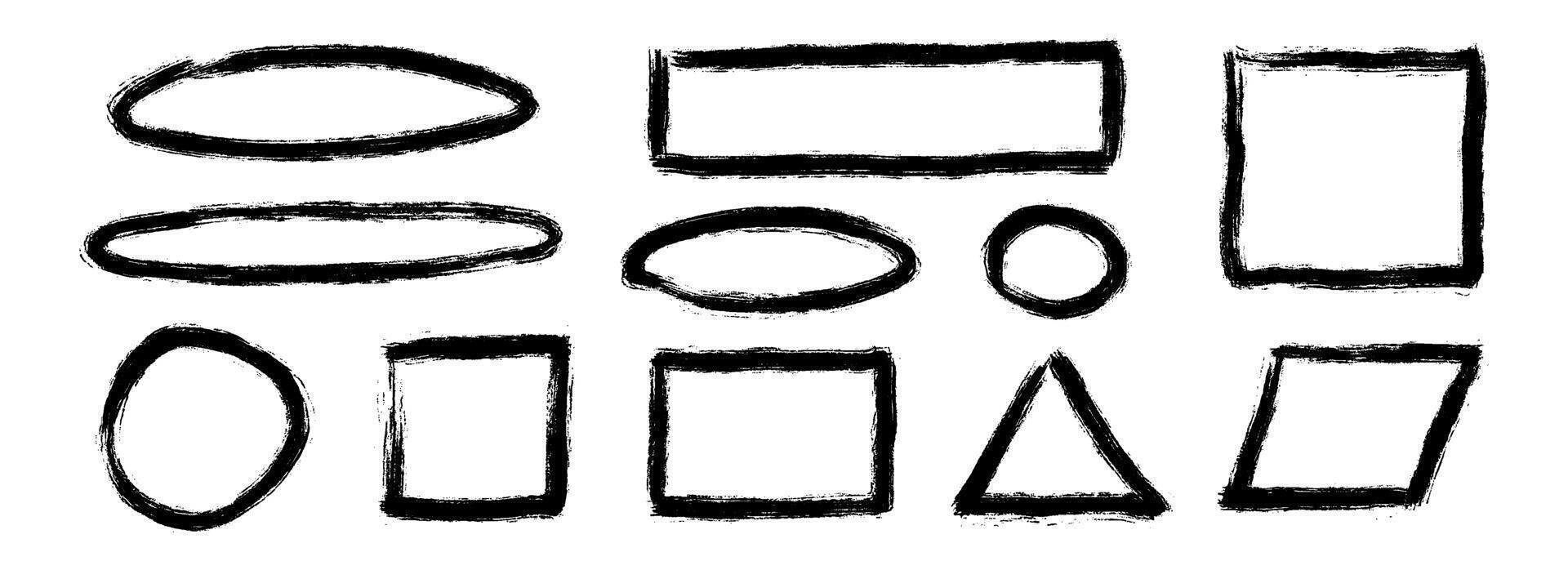 Black charcoal geometric frame set. Rectangle, triangle and circle paintbrush border collection. Rough sketched elements for diagram, highlight, underline, emphasis. Scribbled crayon form pack Pro Vector