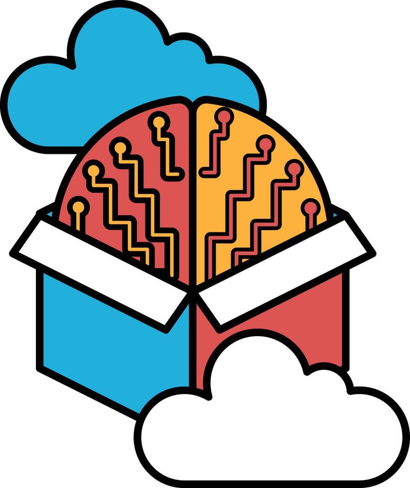 A brain is shown inside a box with a cloud in the background Pro Vector