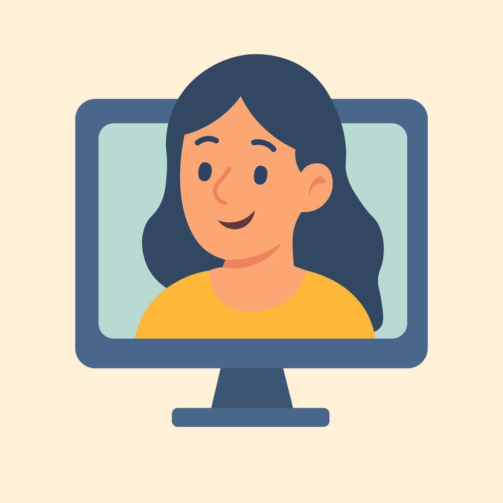 Flat of smiling girl on monitor, symbolizing friendly online communication and virtual connection. Pro Vector