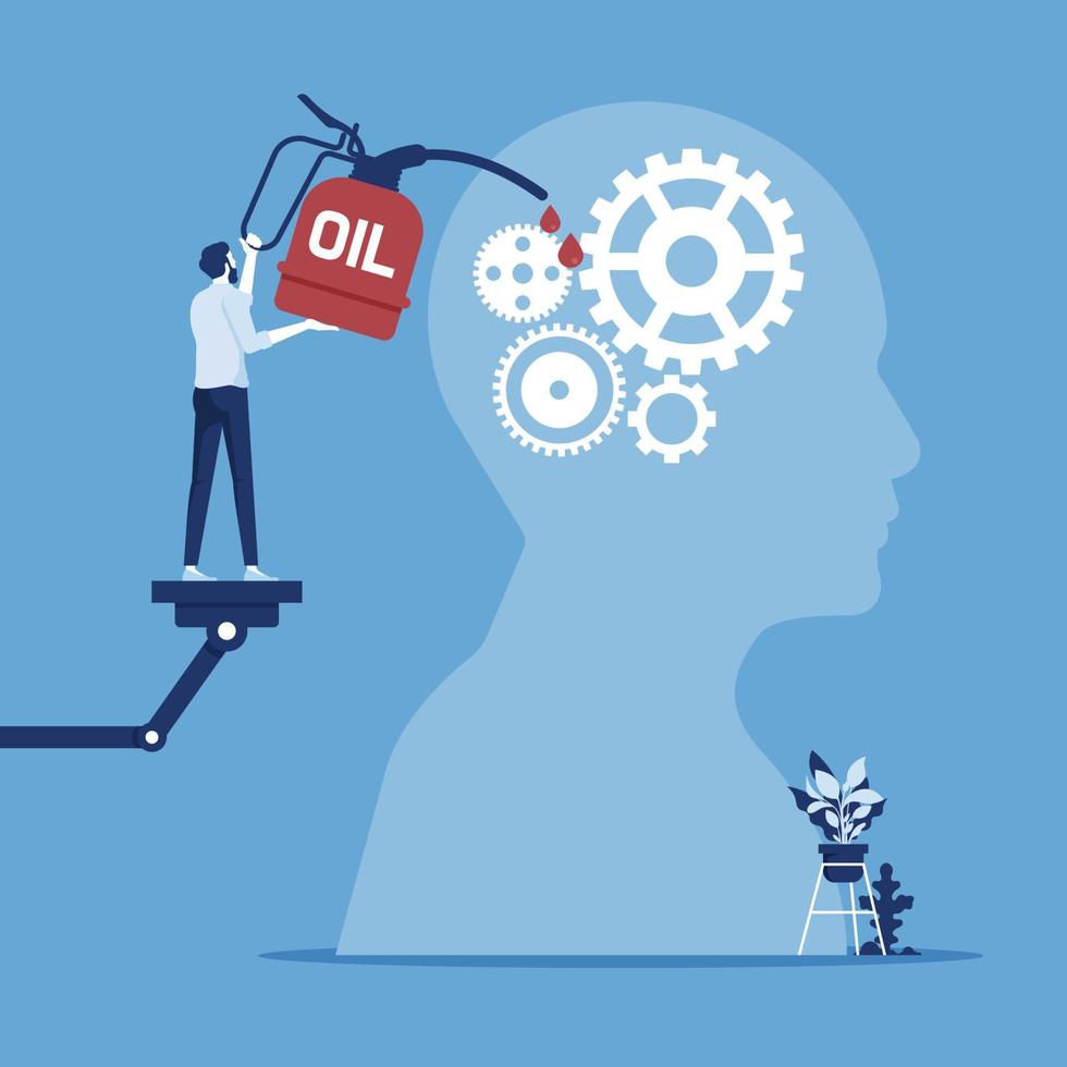 Maintenance brain to generate idea or creativity and innovation to invent new business ideas concept, businessman drop lubricant or grease into gears Pro Vector