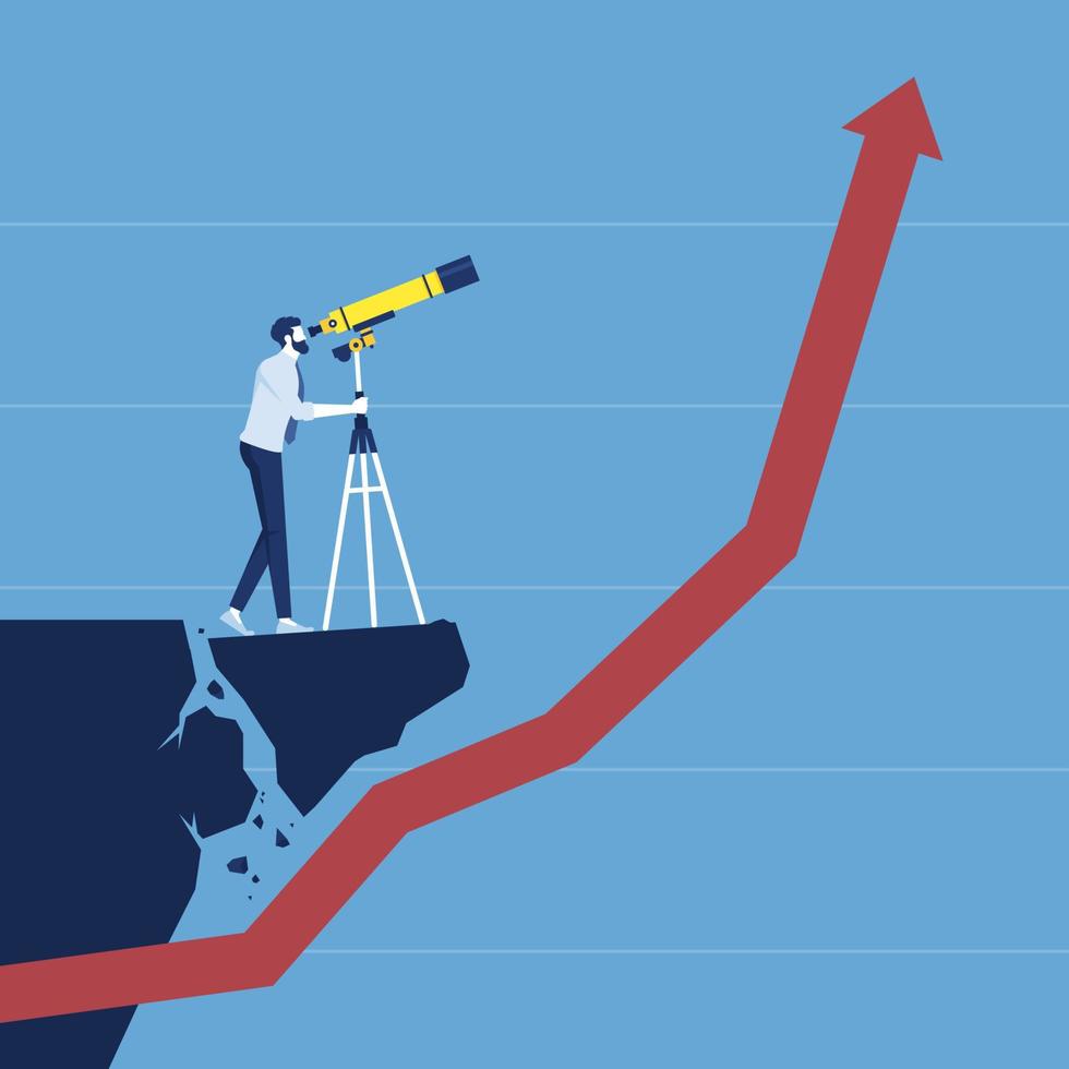 businessman standing on a crumbling cliff looking through a telescope at at a profit arrow pointing upwards depicting unawareness, business concept of obstacles and risk on the way Pro Vector