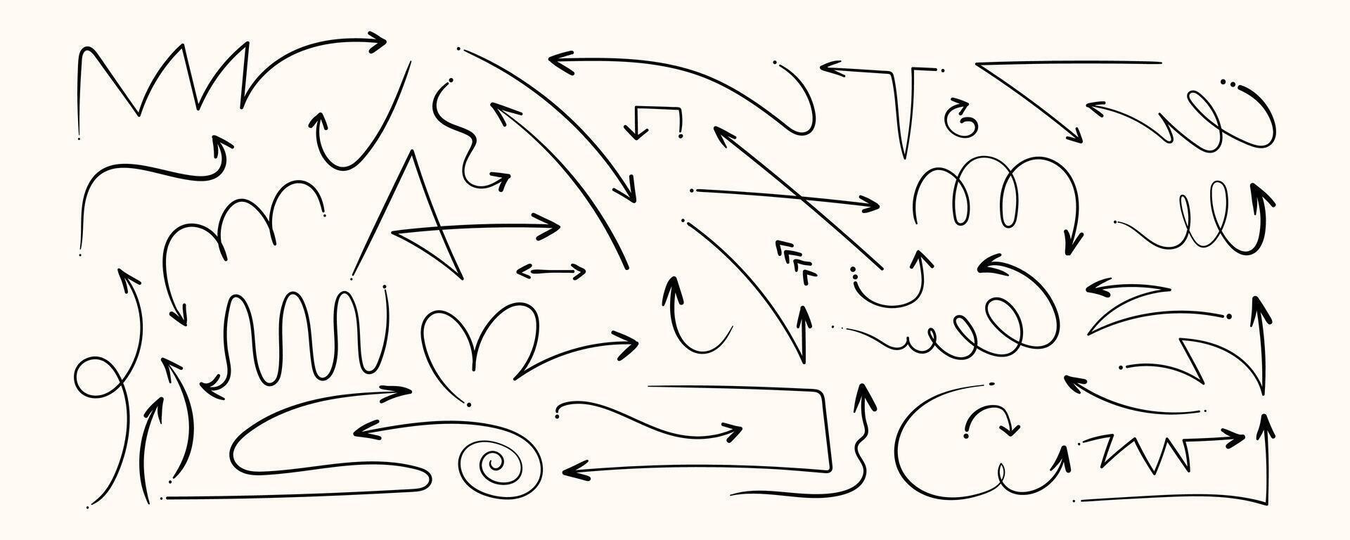 Simple Arrows with Thin Curvy Lines. Geometrical scribbles isolated on white background. Set of doodle arrow icons. Collection of sketchy hand free curved lines and pointers Pro Vector