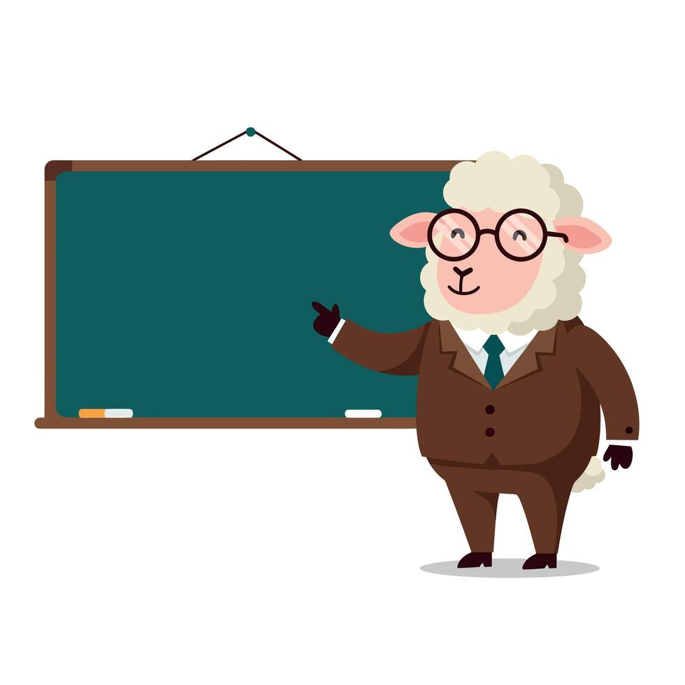 A sheep in a business suit teaching in front of a chalkboard in a flat illustration Pro Vector