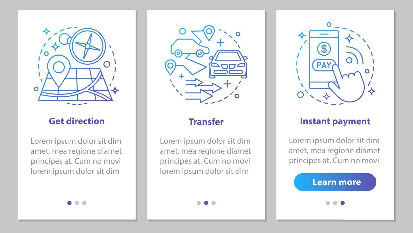 Taxi ordering onboarding mobile app page screen with linear concepts. Get direction, transportation, instant pay steps graphic instructions. UX, UI, GUI vector template with illustrations Pro Vector