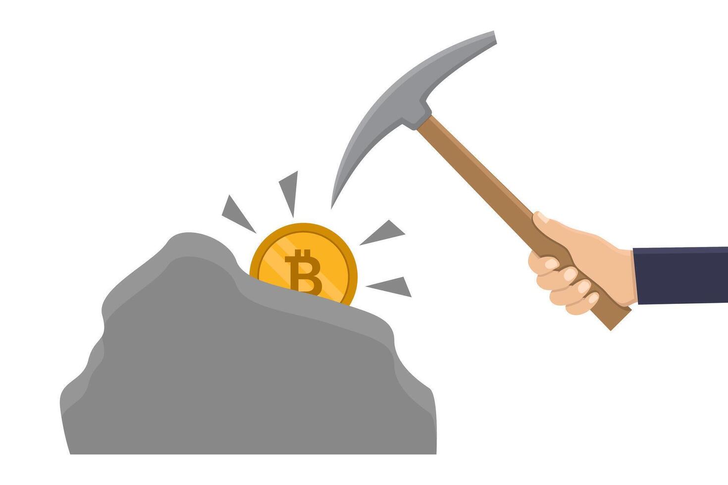 Hand holding a pickaxe is mining a bitcoin from a rock. Pro Vector