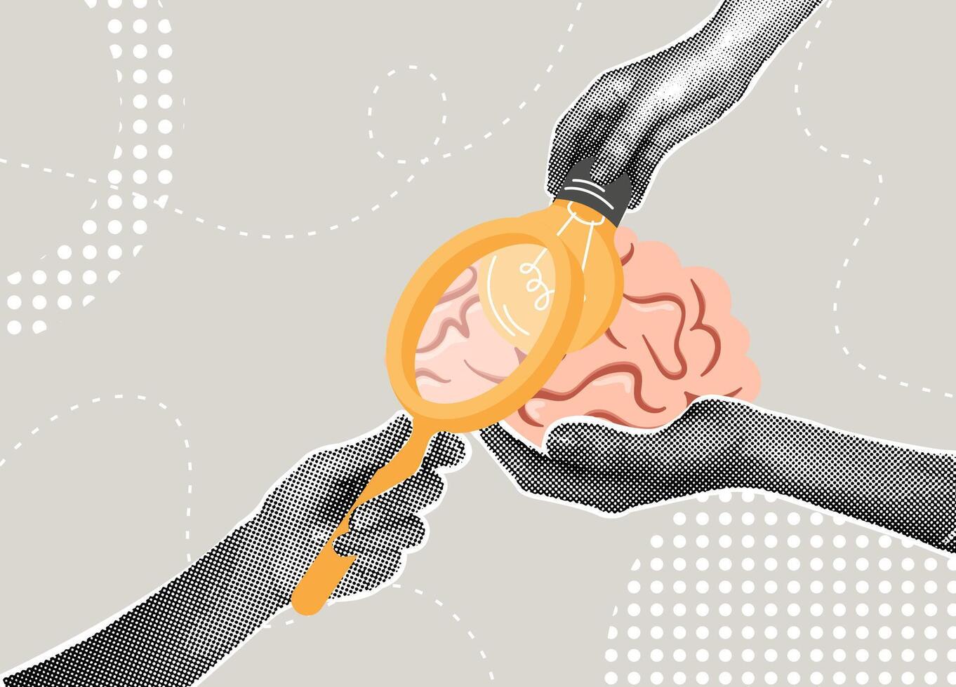 Trendy halftone collage.Concept of finding new ideas in the brain, new opportunities , problem solving, peer help, hints and direction of the path of finding ideas Pro Vector