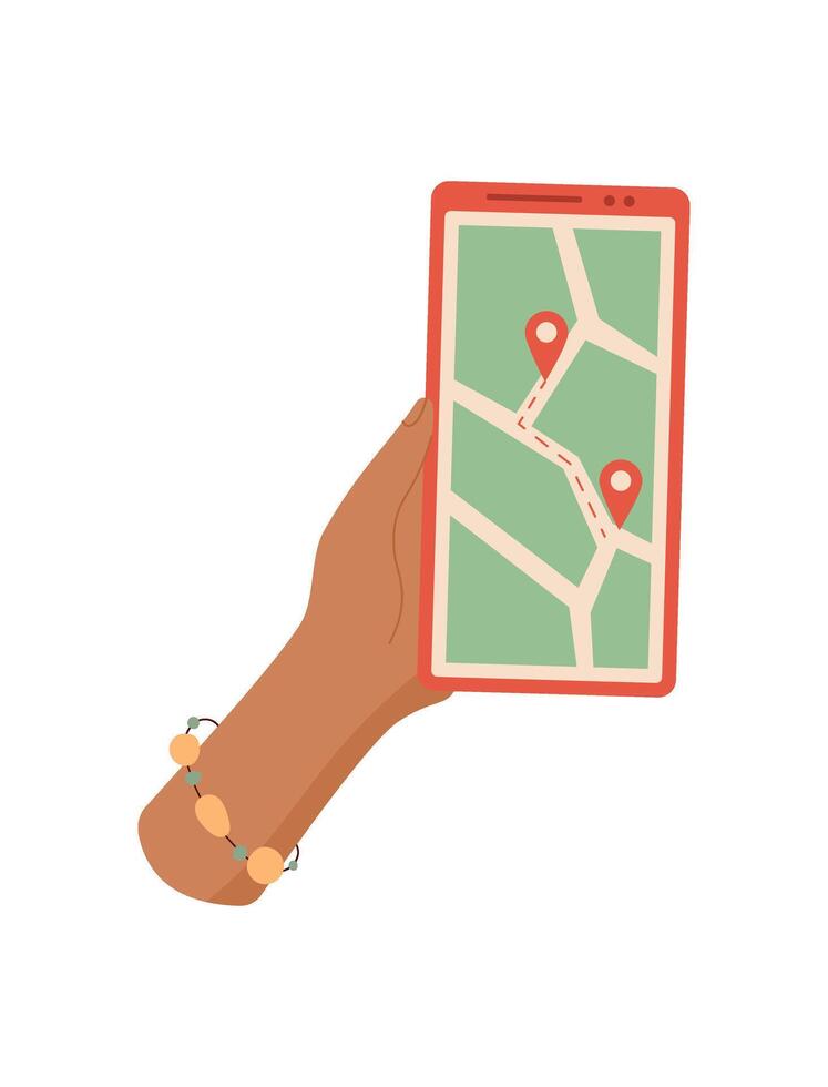A mobile phone held in a hand. A smartphone with a digital map application. The user interacts with the touchscreen for navigation and GPS services, social media context, cool visual style, versatile Pro Vector
