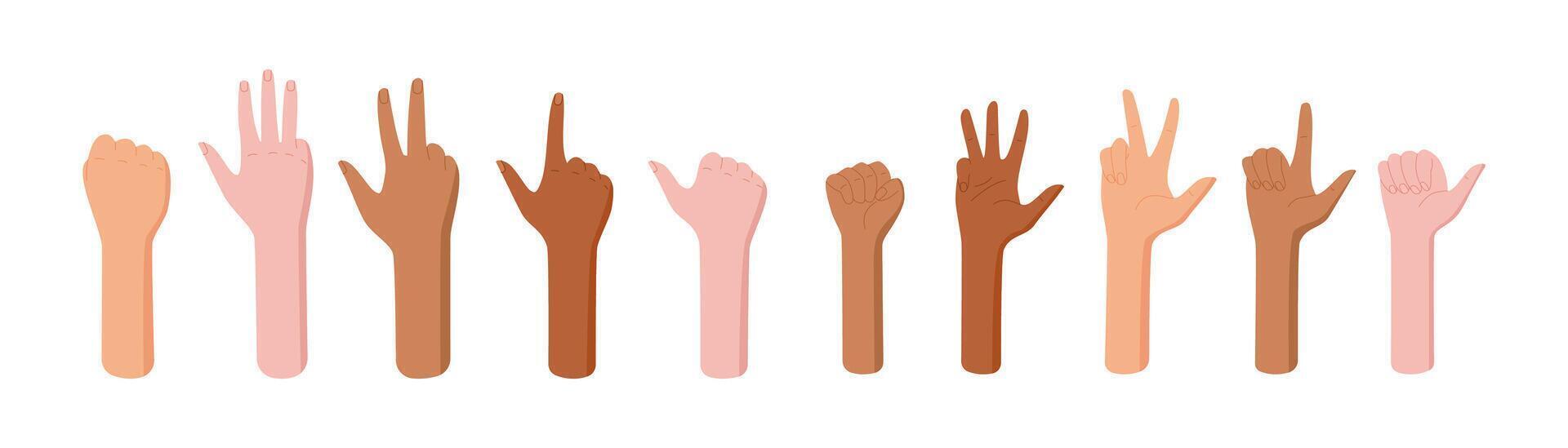 Cartoon flat hand count gesture set of diverse bare arm positions. Variety of finger and palm configurations for counting numbers. Isolated illustration useful for education and professional context. Pro Vector