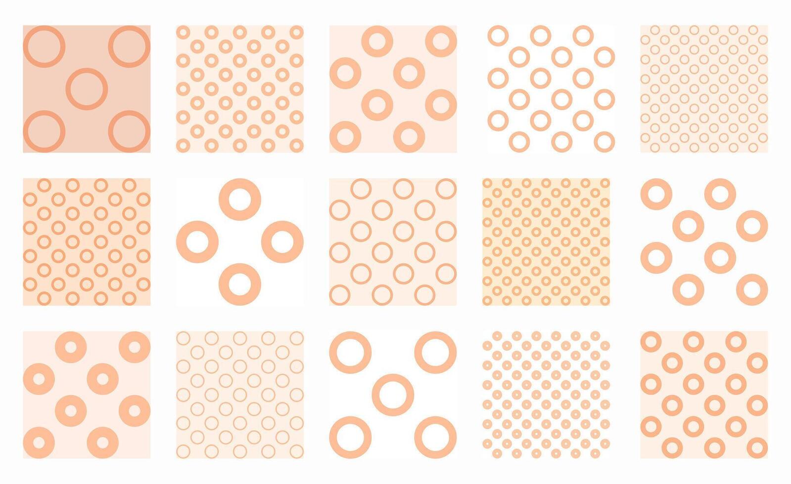 Minimalist set of patterns in Peach Fuzz, featuring soft rings and circles in balanced grids. Perfect for warm backgrounds, gentle wallpapers, textiles, and modern, elegant designs. Pro Vector