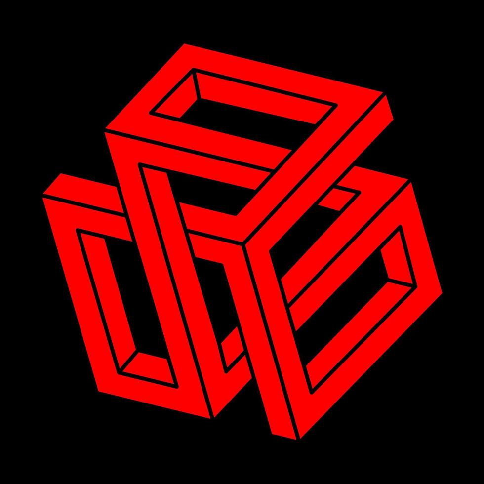 Impossible shapes. Sacred geometry figures. Optical illusion. Abstract eternal geometric object. Logo. Impossible endless outline. Optical art. Impossible geometry shape on a black background. Pro Vector