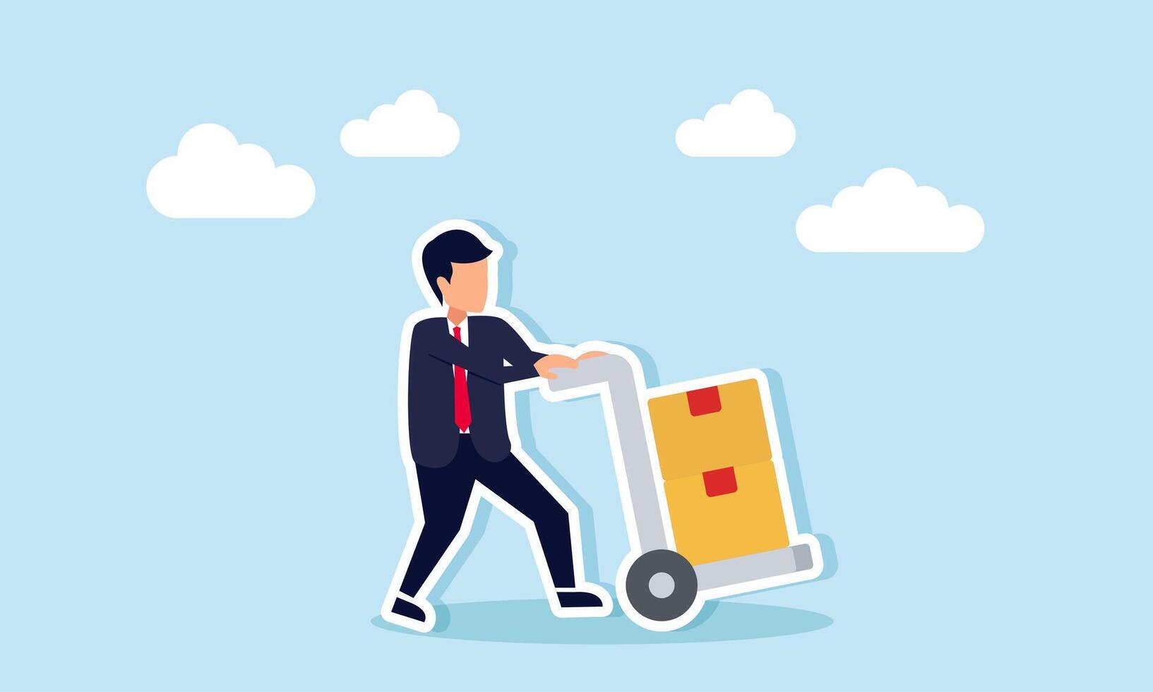 A businessman pushes a stack of package boxes using a hand trolley, illustration of business in the logistic sector Pro Vector